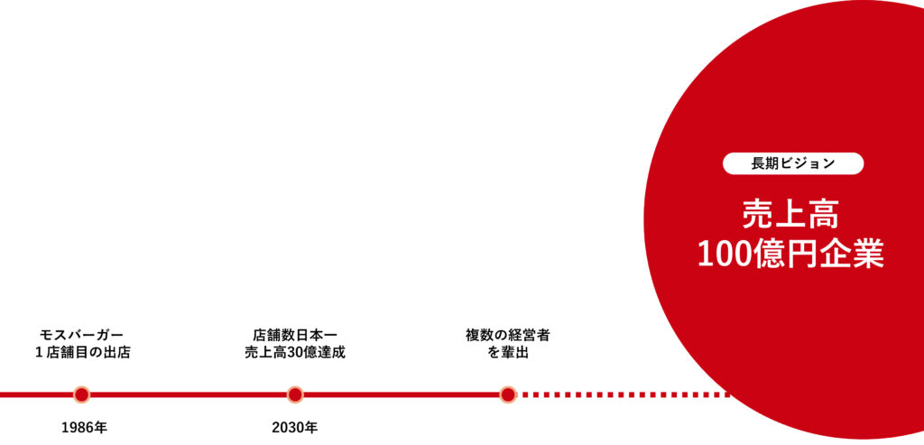 クリエイティブジャパンは、都心部では成功が難しいと言われるモスバーガー事業において、圧倒的な成功事例を生み出し、モスバーガーにおける“ビジョナリー・カンパニー”を目指しています。若い人たちが、単なるアルバイトや社員としてではなく、将来を見据えたキャリアビジョンを描ける場所にしていく。そのために、リーダー育成には特に注力しており、意欲と行動力がある若者には年齢に関係なくチャンスをどんどん与えていく環境を整えています。目指すは100億円企業。その実現のために、複数の「経営者」を育てることにも力を入れています。